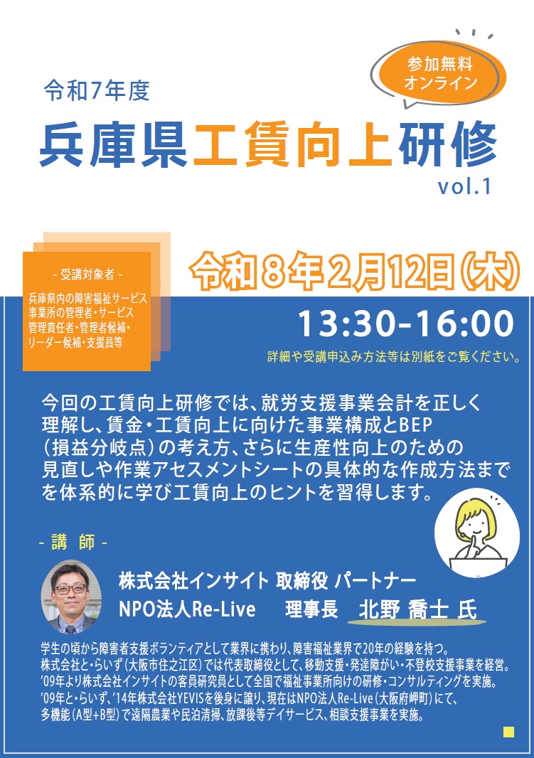 「令和7年度工賃向上研修会」(主催:兵庫県、運営:兵庫セルプセンター)を下記要領にて