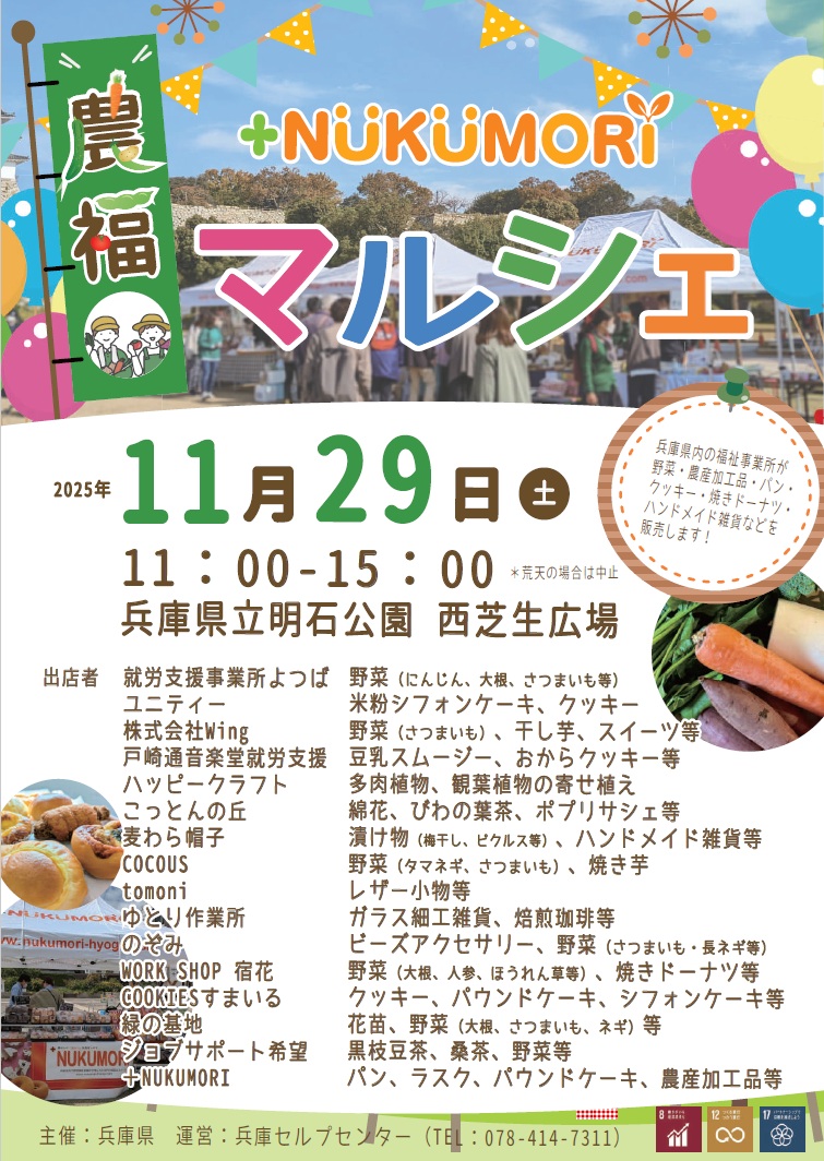 令和7年11月29日(土)10時~15時 兵庫県立明石公園内の西芝生広場にて「+NUKUMORI農福(ノウフク)マルシェ」を開催します。